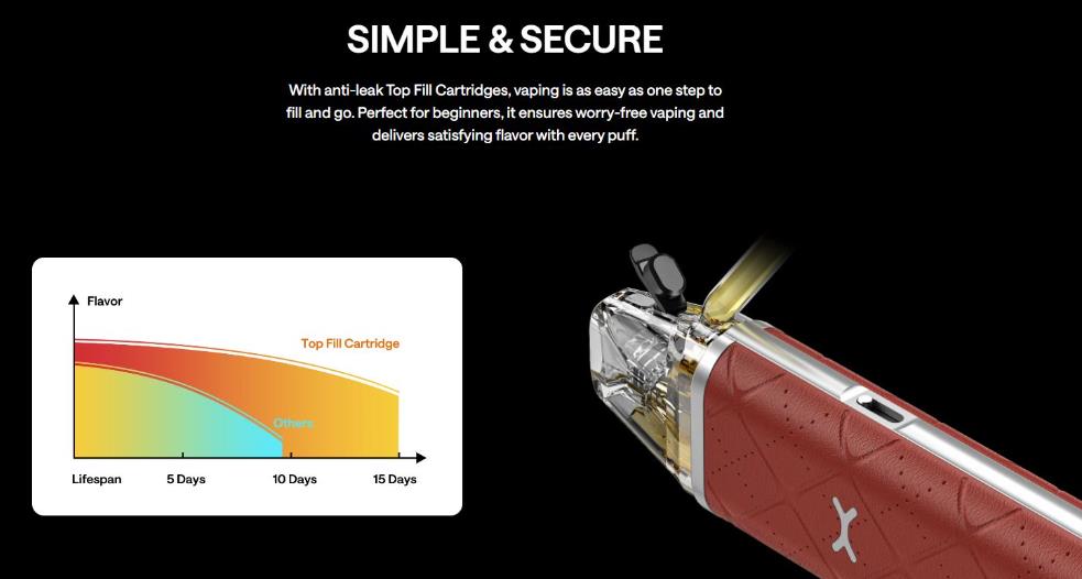 Gracias a los pods de llenado superior antifugas, este dispositivo ofrece un uso sencillo y limpio en un solo paso, evitando preocupaciones y ofreciendo un sabor satisfactorio en cada inhalación.
