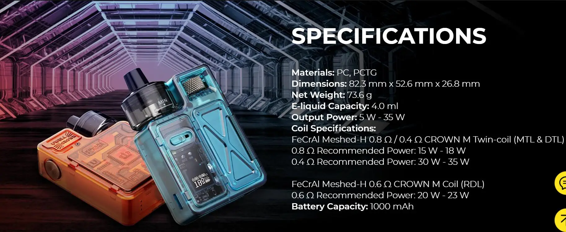 El Pod Crown M Uwell tiene un aspecto futurista, con una carcasa transparente, disponible en 4 colores, que muestra claramente el circuito interno. Tiene una batería de 1000mAh para poder vapear todo el día, y se recarga con cable USB Tipo C.